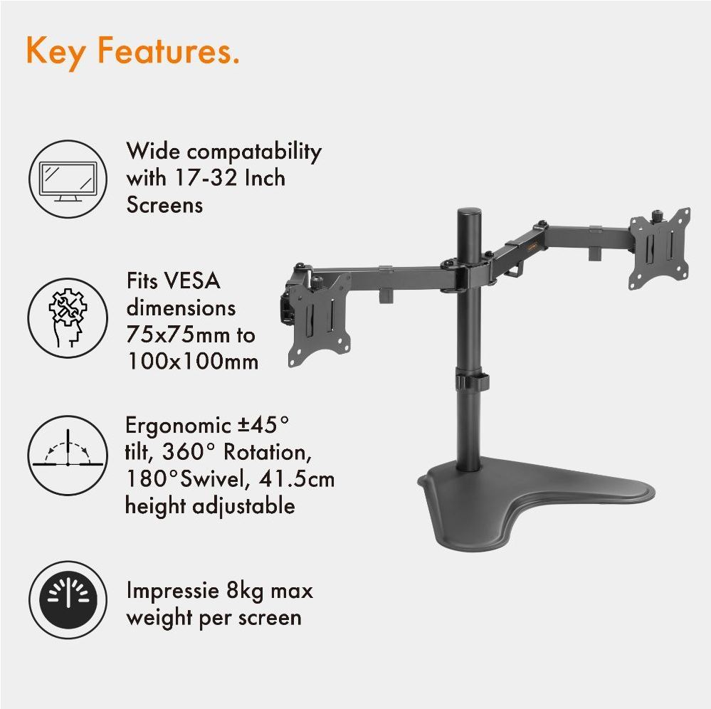 Mount 2 screens to conveniently free up desk space. Featuring +90°/-90° tilt, 180° swivel and 360° rotation for superb flexibility; height adjustable for optimum viewing angle; perfect for multitasks, designers, programmers, gamers alike.