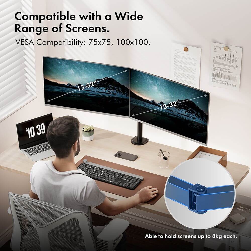 Monitor stands taking up too much desk space? Then take a look at the fully adjustable Specola Double Arm Desk Mount! A stylish and convenient way to free up space on overloaded desks, the mount offers a reliable solution for those working from two screens. This strong steel dual mount lets you view both screens comfortably, giving you the freedom to fully adjust screen positioning according to your individual needs.