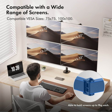 Free up valuable desk space and achieve the perfect viewing position with the VonHaus Quad Monitor Mount. The strong clamp fixes the mount to your desk surface while the adjustable plate allows the monitor to be freely adjusted.