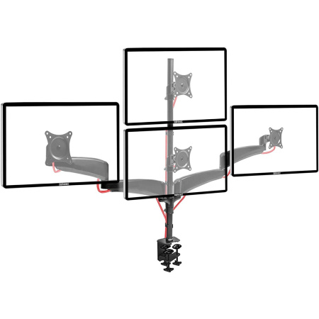 This model holds 4 screens. Two screens sit on two extended arms which have three joints on each that swivel 180°, these joints enable the user to manoeuvrer two of the screens easily and also bring them forwards and backwards. The other 2 screens are placed on VESA brackets vertically against the pole. The VESA brackets which hold the screens offer adjustability, they can swivel left/right, tilt up/down and rotate 360° allowing you to view the monitors vertically.
