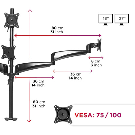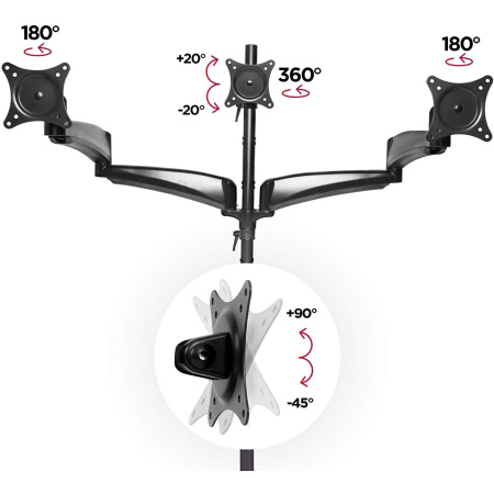 - Our range of industry-standard models provide ample flexibility thanks to the adjustable VESA brackets sturdy swivelling arms. The double arms can be manoeuvred higher or lower on the fly, just simply by holding the screens and directing it into the desired position. While the 2 screens on the vertical pole can be manoeuvred to any height.